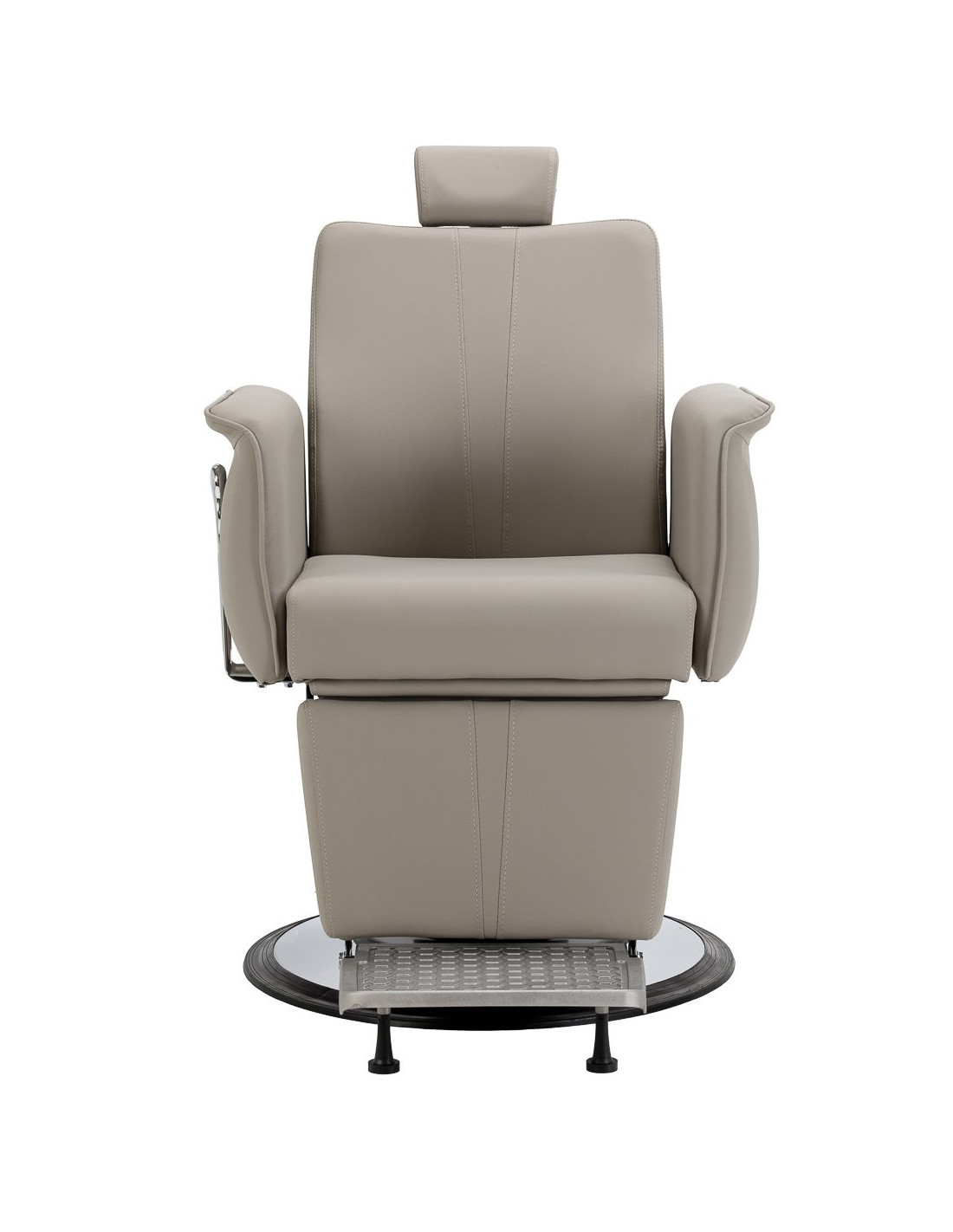 Elegantiškas dizainas ir didelis funkcionalumas. Stabilus, apvalus pagrindas su metaline apdaila užtikrina patikimą atramą ir naudojimo saugumą. Sėdynė, atlošas ir kojų atrama užpildyta deformacijai atspariu putplasčiu ir padengta juoda, malonia liesti sintetine oda užtikrina ilgaamžiškumą ir aukštą naudojimo komfortą. Naudojamos medžiagos yra atsparios drėgmei ir lengvai valomos, todėl kėdė puikiai tinka kasdieniam naudojimui. Subtilios spalvos ir klasikinė forma leidžia harmoningai įsilieti į modernių ir tradicinių kirpyklų dekorą. Detalesni matmenys pateikti nuotraukoje.