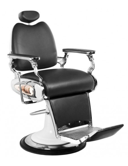 Kirpyklos kėdė barbero salonui juodos spalvos. Aukšta kokybė, atsilošianti atgal. Lengvesnis atsilošimo pakėlimas - pneumatikos pagalba. Atsilošiant - kyla pakojis ir atsilošimo funkcija. Užlenkiamas pakojis, reguliuojamas galvos atlošo ilgis, kurį galima nuimti. Vertikalus prasiuvimas, danga speciali eko oda. Apsisuka 360º, lengvas valdymas hidraulikos pedalu. Apvalus stovas, po kuriuo apsauginė guma.