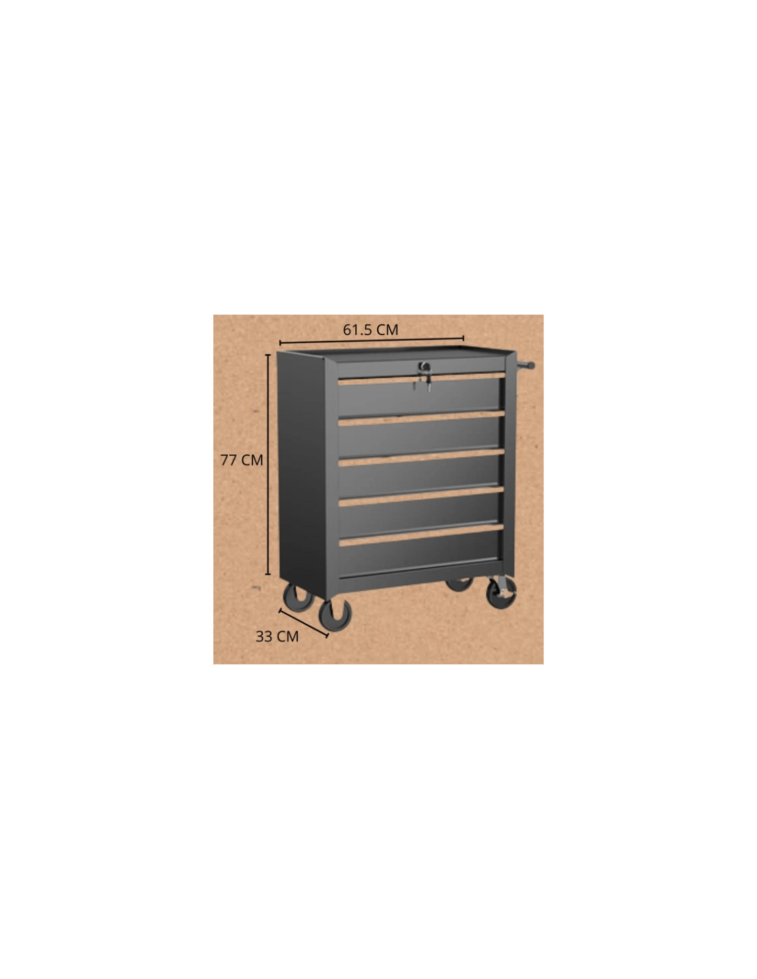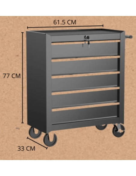 Kirpyklinis vežimėlis. Juodo metalo vežimėlis su penkiais vienodais stalčiais ir neslystančiu dėklu, centriniu raktų užraktu, šoninė rankena, ir 10,2 cm neplaukiantys ratukai (du su stabdžiais); sveria 21 kg, atlaiko 180 kg ir gali būti tvirtinamas prie sienos per keturis galinius inkarus.