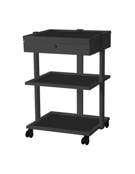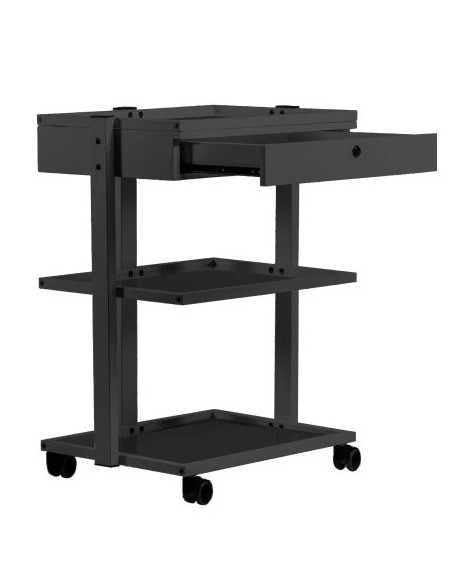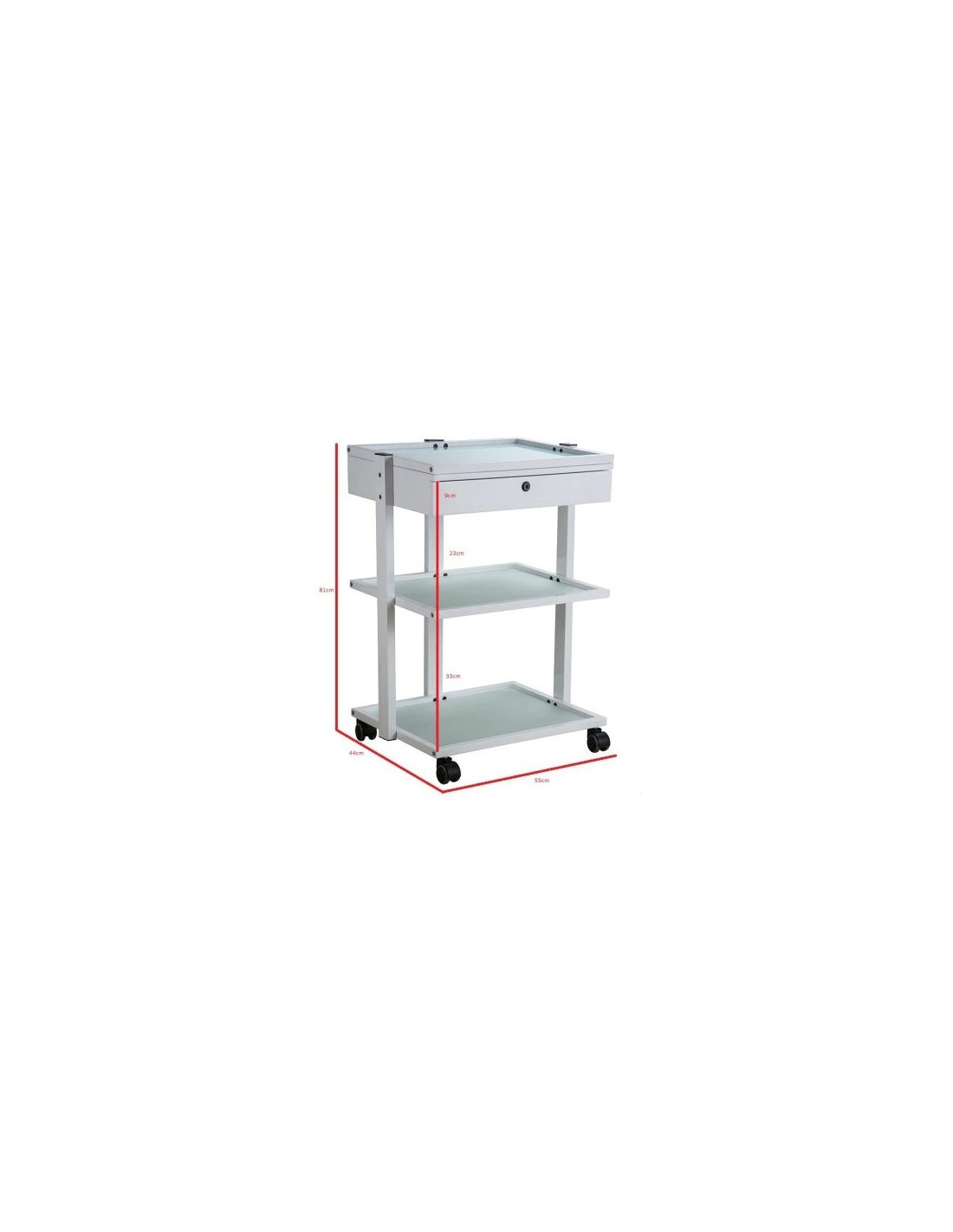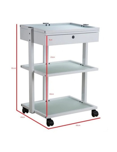 Kosmetinis vežimėlis, paprasta ir praktiška konstrukcija. Įrengta 1 stalčiukas ir 3 erdvios lentynos pagamintos iš permatomo stiklo. Metalinis korpusas. Anga lempai, surenkant vežimą nustatysite patys kur bus anga. Visiškas mobilumas dėl 4 ratų.