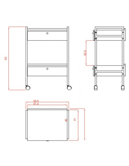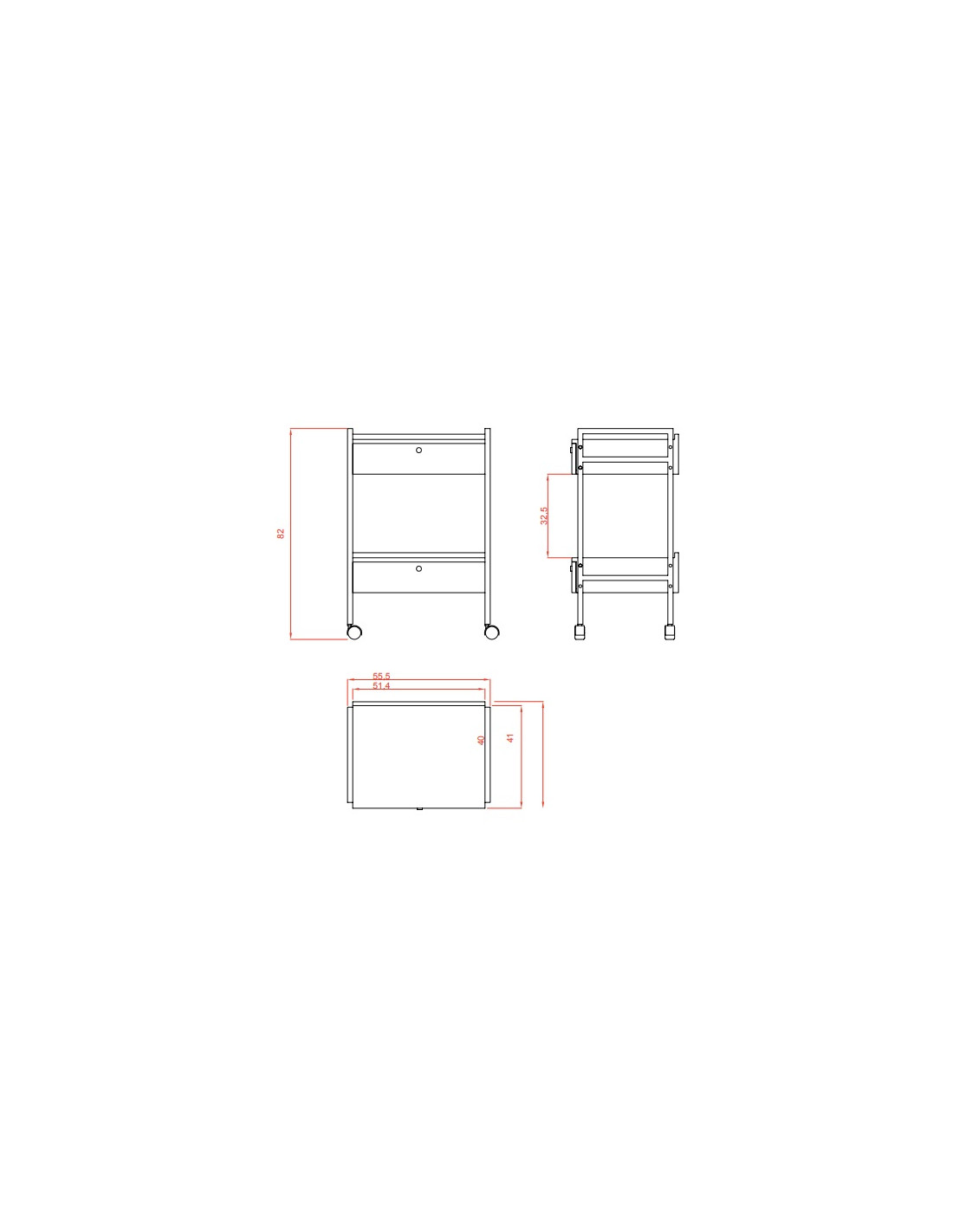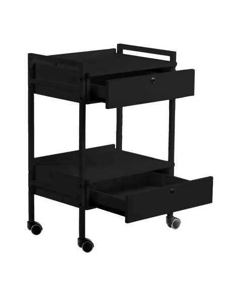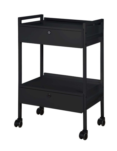 kosmetologinis vežimėlis su 2 rakinamais stalčiais ir 2 lentynom juodas. Stabilus metalinis korpusas, stalčiai ir lentynos pagaminti iš MDP (medienos plaušų plokštės). Abu stalčiai užsirakina, galima saugiai laikyti daiktus. Su ratukais, todėl yra patogu naudoti. Yra speciali anga įstatyti lempai, todėl galima sutaupyti vietos kabinete.