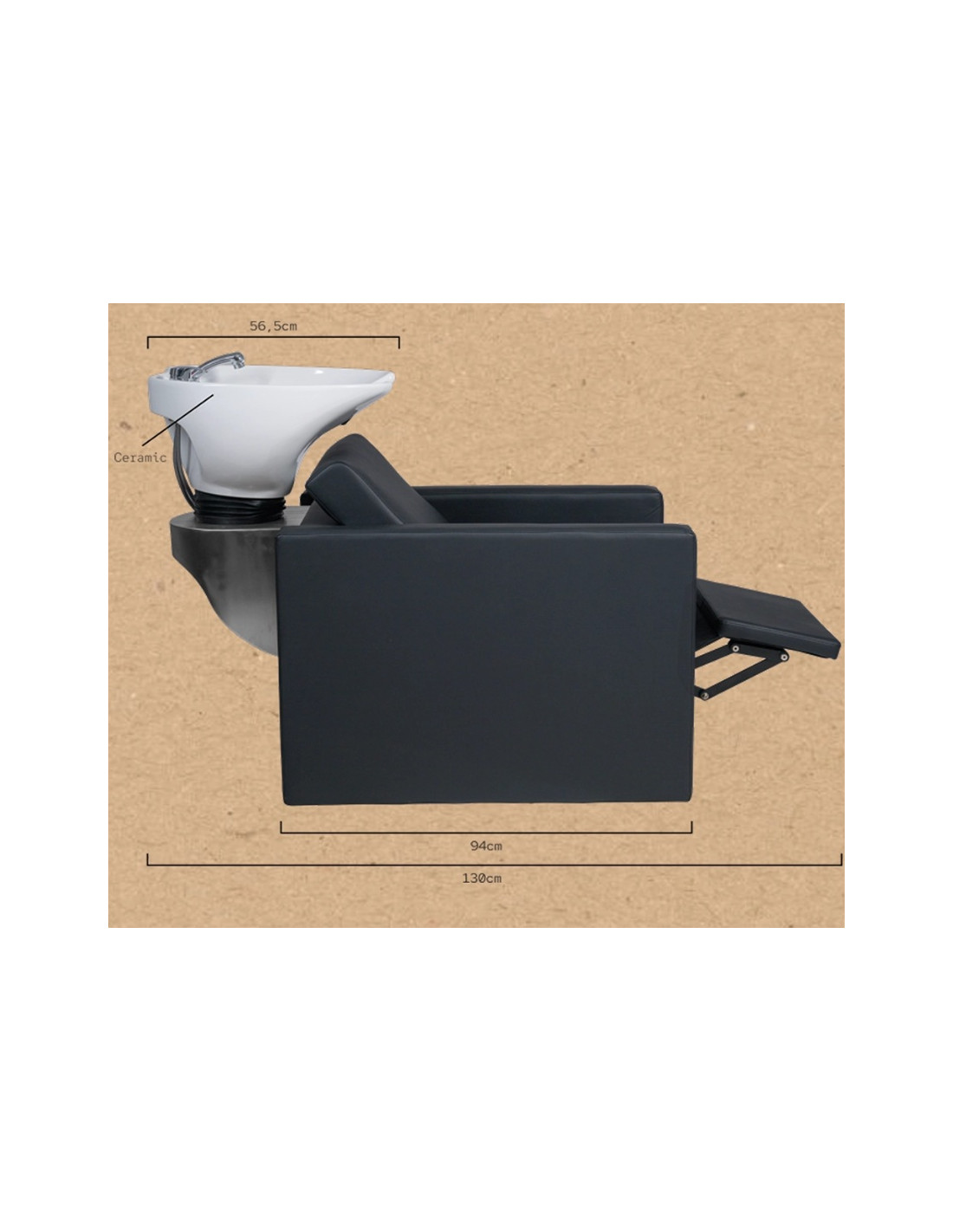 Kirpyklos plautuvė su elektra valdoma kojų atrama, su integruotu mygtukų skydeliu, idealiai tinka klientų patogumui ilgesnių procedūrų metu.