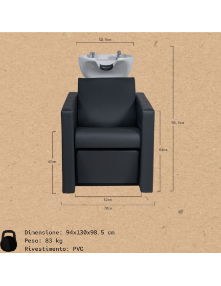Vidinė plautuvės konstrukcija - metalas. Sėdynė ir atlošas tinkamu nuolydžiu, kad klientui būtų patogu sėdėti ilgesniu procedūrų metu. Atlošas turi papildomus paminkštinimus juosmens srityje. Gili keramikinė kriauklė yra reguliuojama pakreipimo mechanizmu. Kokybiški, chromuoti, nerūdijančios plieno santechniniai vamzdžiai ir detalės. Chromuotas vandens maišytuvas su poliamido vamzdžiu. Be jokių papildomų įrankių nuimamas atlošas - lengvam montavimui. Aukštos kokybės juodos spalvos, lengvai valomi, EKO odos danga.