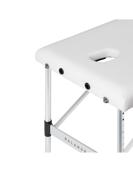 Patogus masažo stalas, būtinas fizioterapijoje. Sulankstomas masažo stalas BALANCE su aliuminio kojomis – praktiškas ir universalus sprendimas, sukurtas kasdieniam masažuotojų, kineziterapeutų ir kitų specialistų darbui. Trijų segmentų struktūra užtikrina stabilumą ir komfortą tiek atliekančiam asmeniui, tiek pacientui. Dėl savo kompaktiškų matmenų, lengvumo ir pridedamo krepšio jis puikiai tinka ir mobiliam darbui – leidžia greitai ir patogiai sulankstyti ir neštis. Paprastas aukščio reguliavimo mechanizmas. Stalo aukštis gali būti reguliuojamas pagal ūgį ir individualius gydymą atliekančio asmens poreikius naudojant teleskopinį reguliavimą 62-80 cm diapazone su fiksavimo mechanizmu. Kiekviena aliuminio stalo kojelė susideda iš dviejų vamzdžių, kuriuos po atrakinimo galima laisvai perkelti vienas kito atžvilgiu.