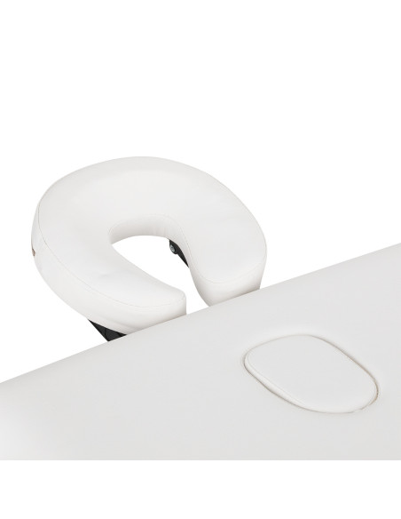 Fast Lock mechanizmas išlaiko elementus pasirinktoje padėtyje, įdėjus spyną į atitinkamą angą. Be to, rėmo konstrukcija stabilizuojama metaliniais trosais, todėl masažo stalas yra tvirtas ir puikiai tinka įvairioms paslaugoms atlikti. Nugaroje atliekamų procedūrų patogumas Siekiant užtikrinti maksimalų komfortą, stalu besinaudojantis asmuo gali padėti galvą ant komplekte esančios ergonomiškos galvos atramos. Šį elementą lengva reguliuoti – jis leidžia reguliuoti pasvirimo kampą dviejose plokštumose, kas leidžia tiksliai pritaikyti jo nustatymą pagal vartotojo poreikius ir atliekamo gydymo pobūdį. Atliekant terapiją gulint, galvos atramą galima nuimti naudojant specialią angą stalviršyje. Kai nenaudojama, skylę galima uždengti pridedamu kamščiu, atkuriant paviršiaus estetinę ir vienodą išvaizdą.