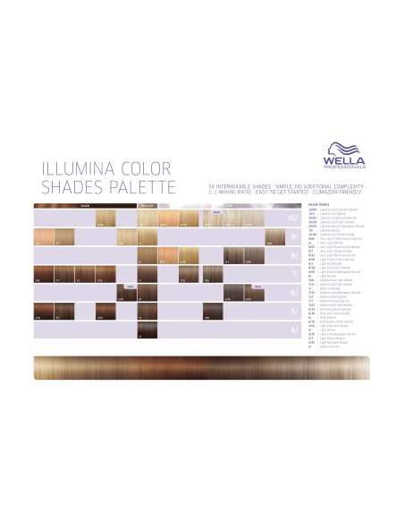 Wella Illumina Color itin aukštos kokybės permanentiniai / ilgalaikiai plaukų dažai, kurie suteikia plaukams pribloškiančią spalvą ir sodrų atspalvį bet kokiame apšvietime. Profesionali priemonė su padidinta apsaugine sistema nudažo iki 100 procentų žilų plaukų. Visi ILLUMINA COLOR atspalviai yra maišomi tarpusavyje, kad būtų sukurtas spalvų tonas, tinkantis jūsų klientams ir leidžiantis būti kūrybiškiems. Atspalviai susideda iš šiltos, neutralios ir šaltos spalvų paletės.